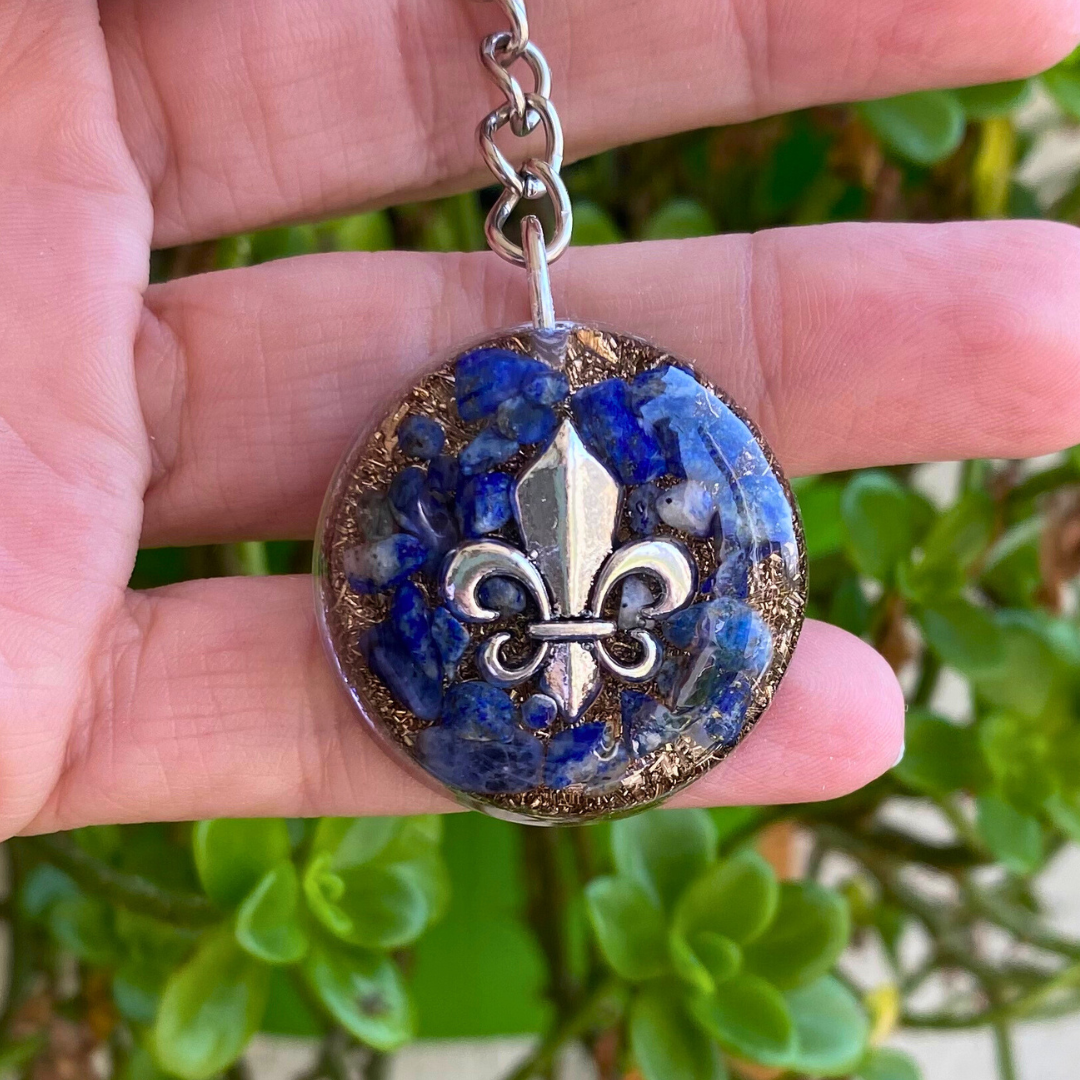 Llavero de orgón con símbolo de la Flor de Lis, elaborado con lapislázuli, creado como un amuleto de protección, claridad mental y fortaleza interior. Su tamaño de 3 cm lo hace liviano, práctico y fácil de llevar cada día.