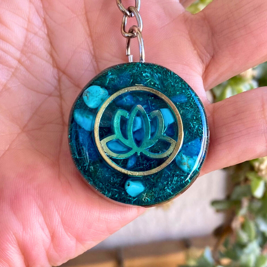 Llavero de orgón con símbolo de la Flor de Loto en tono turquesa, elaborado con turquesa, cuarzo rosado y piedra luna. Un amuleto energético de 3 cm, ideal para acompañarte cada día con calma, equilibrio y protección.