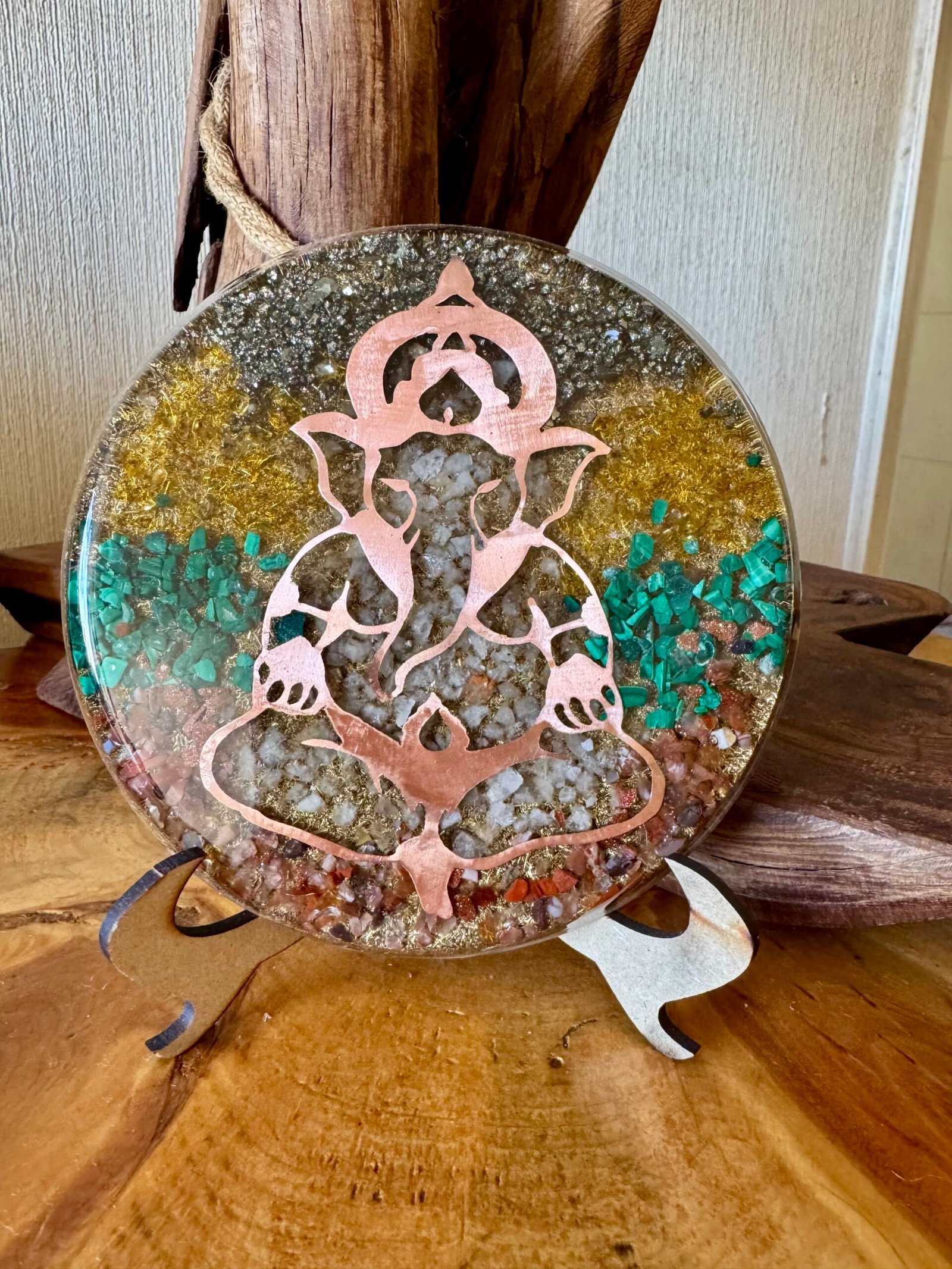 El orgón ayuda a transmutar energías densas en frecuencias más elevadas, mientras que el símbolo de Ganesha —deidad que remueve obstáculos— potencia la abundancia, la protección y la apertura de nuevos caminos.