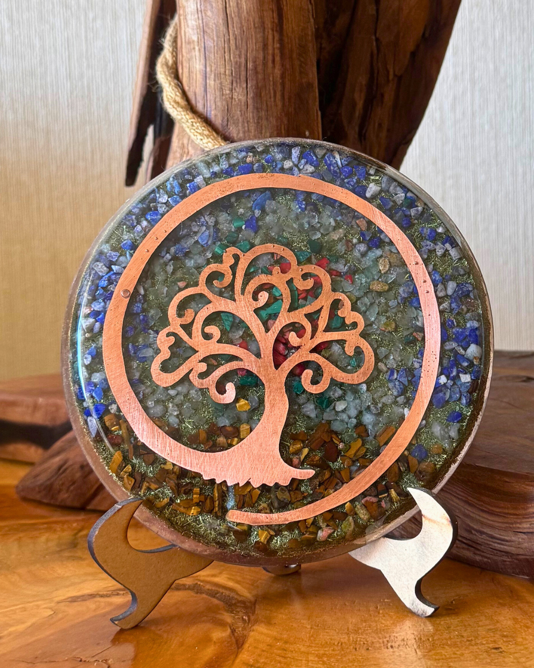 Este plato de orgón fue creado con la intención de fortalecer la confianza personal, sanar el corazón y abrirnos a una conexión espiritual más profunda, armonizando la energía del espacio donde se ubique.