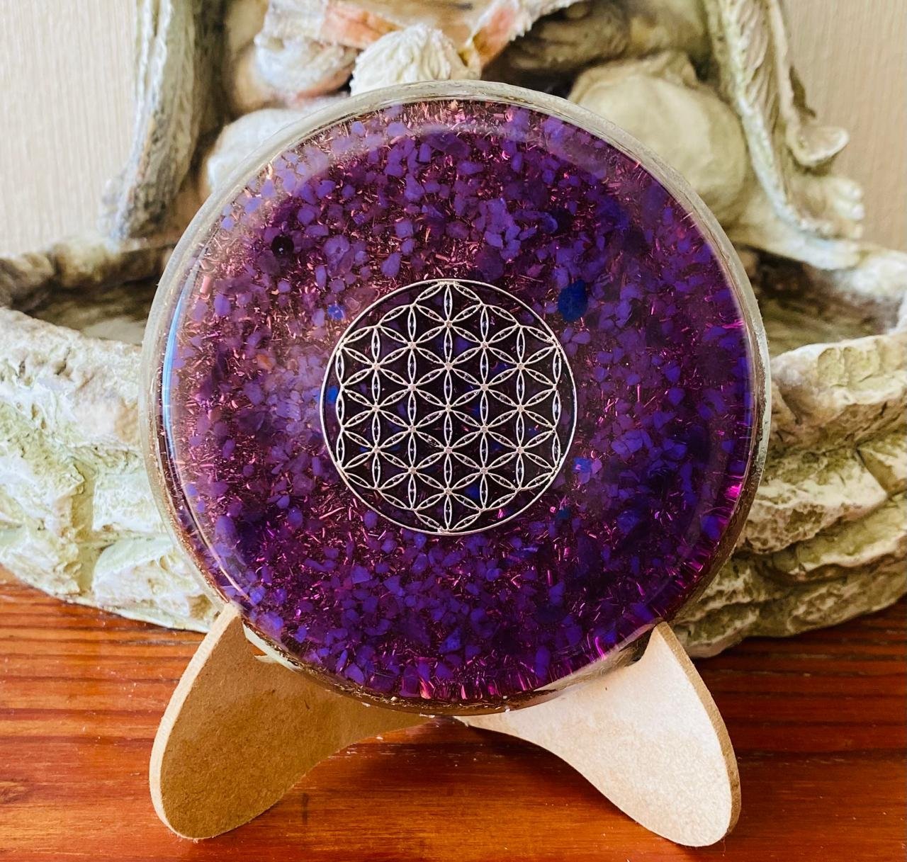 Un plato de orgón que combina geometría sagrada, energía violeta y cristales naturales para crear ambientes más armónicos y equilibrados.